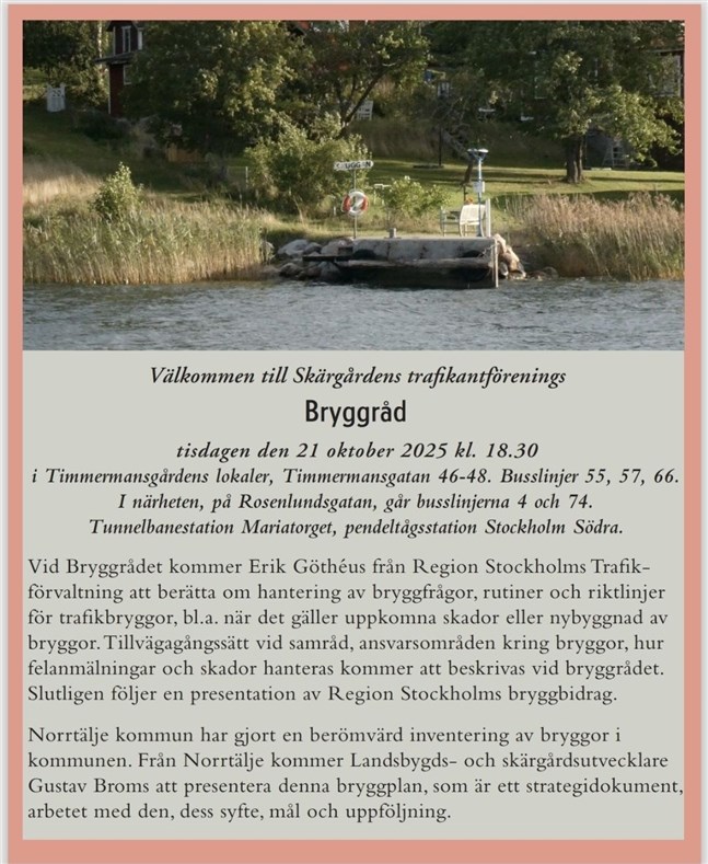 Vid Bryggrådet kommer Erik Göthéus från Region Stockholms Trafikförvaltning att berätta om hantering av bryggfrågor, rutiner och riktlinjer för trafikbryggor, bl.a. när det gäller uppkomna skador eller nybyggnad av bryggor. Tillvägagångssätt vid samråd, ansvarsområden kring bryggor, hur felanmälningar och skador hanteras kommer att beskrivas vid bryggrådet. Slutligen följer en presentation av Region Stockholms bryggbidrag.